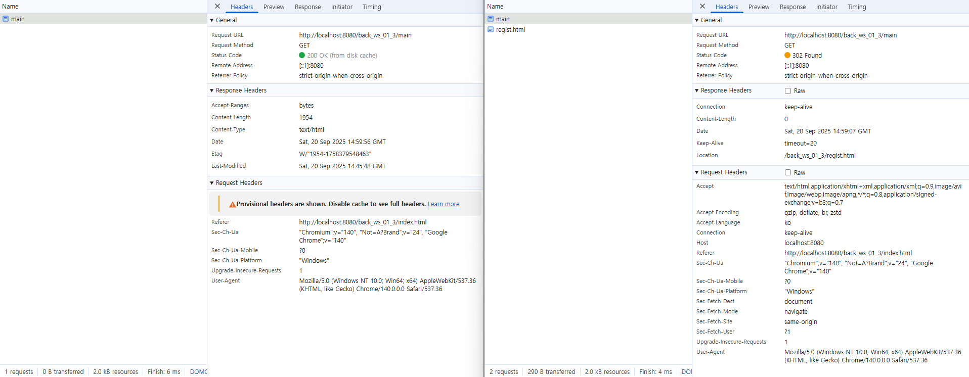 - HTTP 302 응답을 보내고, 브라우저가 다시 /regist.html로 요청.